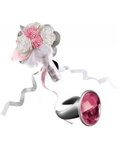 Barbie bridal set includes: Plastic gemstone wedding ring and a white and pink rose bouquet.