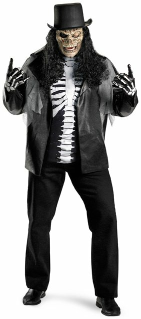 Rock hard and spook your friends with the Cryptic Rocker Costume which includes: A jacket featuring faux leather sleeves, jagged overlay and attached screen-print shirt front. A chinless zombie style mask and a top hat with attached hair are also included in this horrifying hard-rock ensemble.