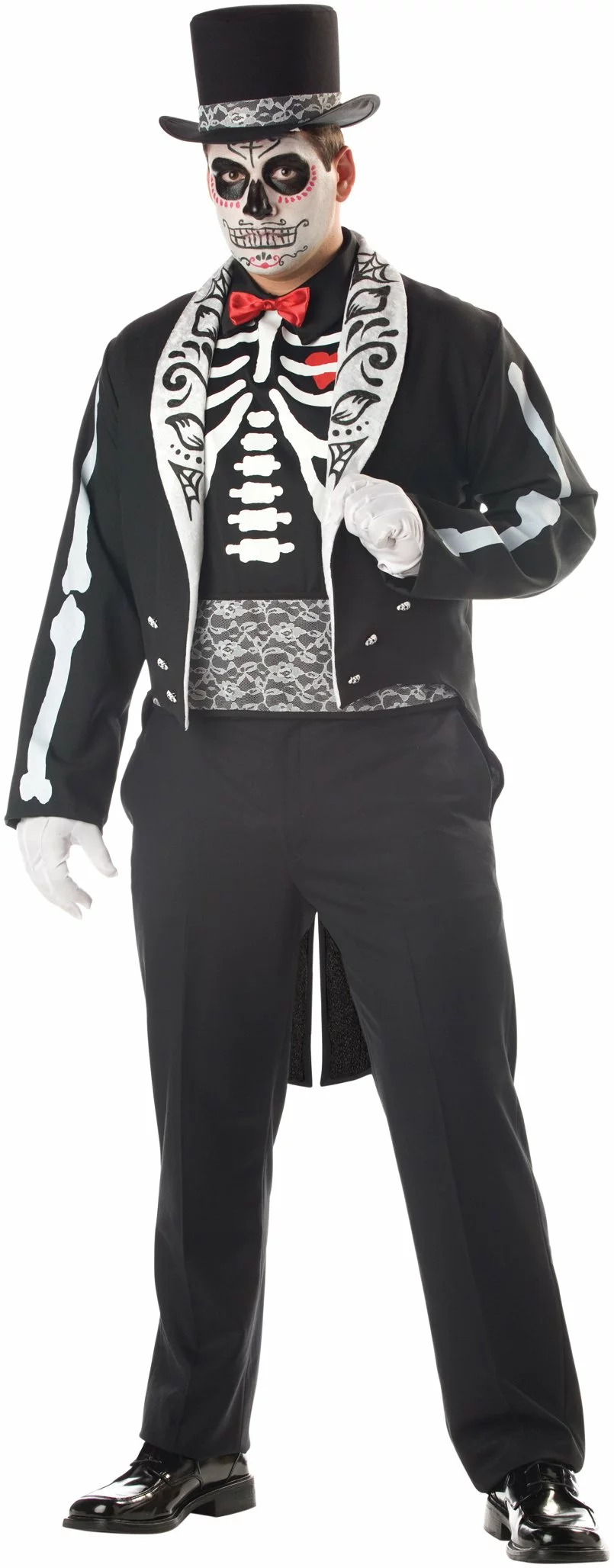 Celebrate the Day of the Dead in this top quality costume which includes: A skeleton screen-printed sleeveless shirt featuring a white lace cummerbund and a blood red bowtie, jacket with folk art motif on the lapels and skull character button details and a top hat featuring a mesh screen-printed character shroud that is easily tucked in when needed.