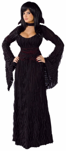 She may look like a tempting little beauty, but don’t get too close or she’ll eat your heart out, boys. This black gothic ruffle sheer gown features an attached belt. It also includes a black slip and a vampire collar. She’s hungry for your lovin’ and your blood!