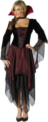 But it was just a love bite! You can count on this disguise to turn heads this Halloween! Includes an iridescent red and black velvet dress with a multi-tiered handkerchief hem and coordinating choker with attached standup collar. The perfect flirty twist on an old horror movie classic.