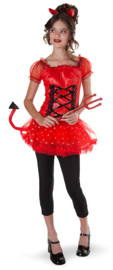 You’ll look adorably evil in the illuminating Lil’ Devil Costume which includes: A stretch knit faux lace-up front dress with layered tutu style skirt featuring fiber optic lights and hidden pocket for on/off switch. Headband with devil horns and devil tail are also included in this darling devil’s disguise.