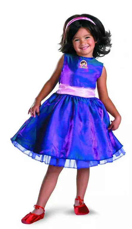 Costume Includes: Dress with attached waist sash, ruffled petticoat, character wig, headband and slippers.