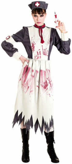 She wonders collecting and healing souls of those who have passed making them stronger than the living! Become a frightening sight on Halloween night dressed as Nurse Mercy! Costume includes a long sleeve gray dress with attached white blood filled apron, and a gray nurse hat.