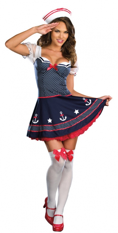 Costume includes: Stretch knit dress with sweetheart neckline has chiffon sleeves, polka dot bodice and a dropped waistline. Anchors on skirt are trimmed with real red bows. Includes hat with bow.