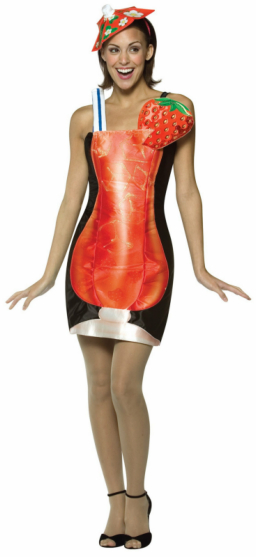 This intoxicating ensemble includes: A charming cocktail glass dress featuring miniature ice and strawberry screen prints, ornate oversized strawberry and straw attachments. An adorable umbrella headband is also included in this sexy and sweet costume.