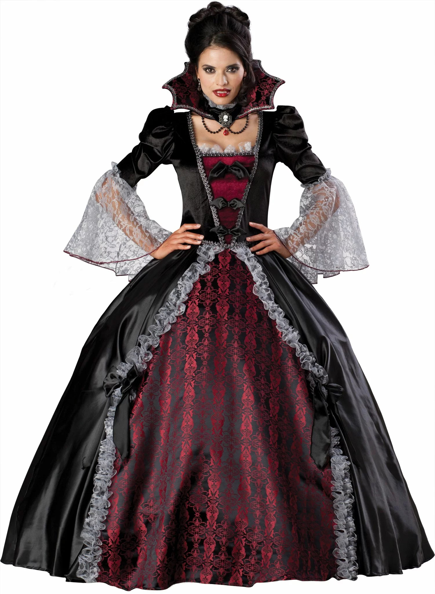Includes gown, petticoat, and collar. Does not include fangs or earrings. Available in adult sizes Small, Medium, Large, and X-Large.